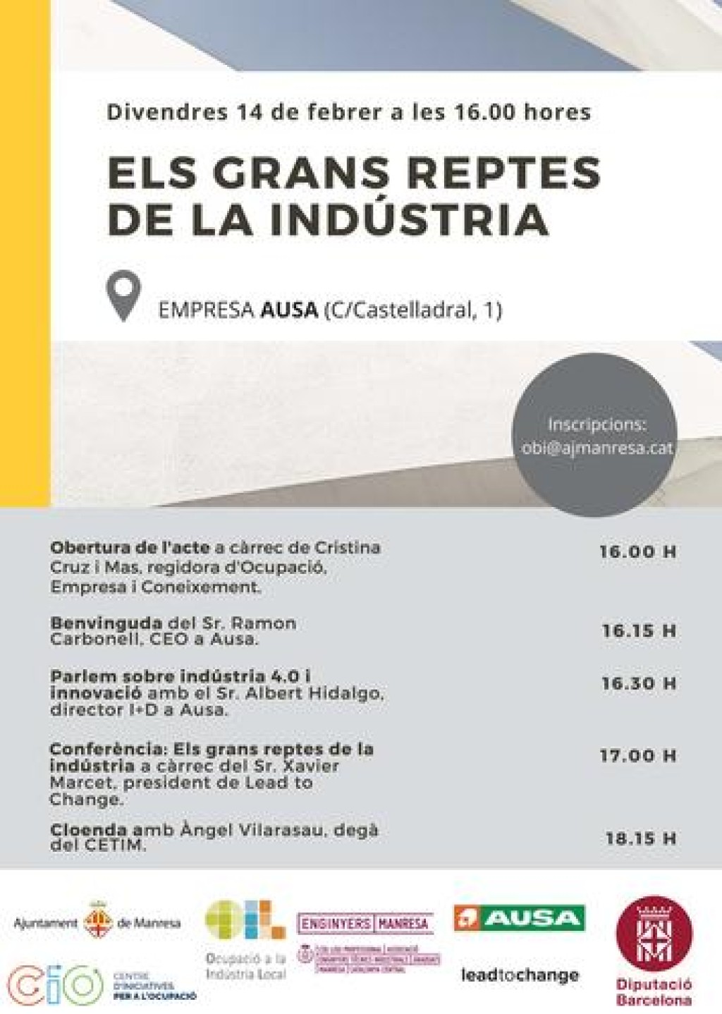 Aquest divendres 14 de febrer, tindrà lloc a l’empresa Ausa l’acte “Els grans reptes de la indústria”, organitzat pel CETIM, juntament amb el programa Ocupació al Bages Industrial (OBI), liderat pel Centre d’Iniciatives per a l’Ocupació (CIO) de l'Ajuntament de Manresa. L’acte és obert a tothom prèvia inscripció a : obi@ajmanresa.cat
