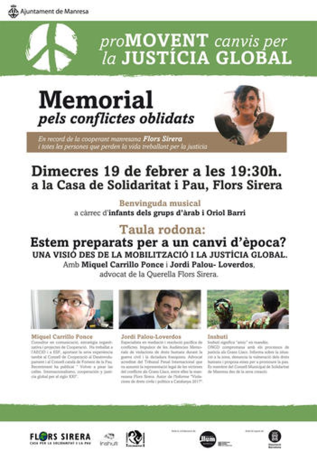 La Casa Flors Sirera acollirà el proper dimecres, 19 de febrer, el “Memorial pels Conflictes Oblidats”, en record de la cooperant manresana Flors Sirera, un acte que enguany forma part dels actes de la Llum, i comptarà amb la participació de veus compromeses i expertes amb les transformacions socials. L’objectiu és crear un espai d’intercanvi que motivi a plantejar canvis tant a nivell personal com col·lectiu per construir societats basades en la justícia.