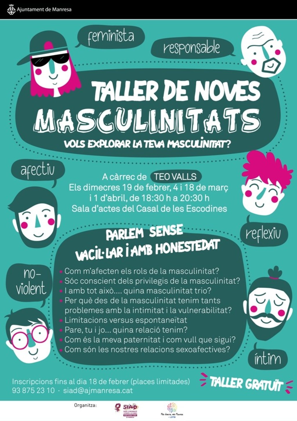 16/02/2020- Aquests tallers, que comencen aquest dimecres, tenen com a objectiu explorar i qüestionar al voltant del model de masculinitat imperant, per a generar eines encaminades a construir nous models en els que els homes puguin sentir-se més representats i còmodes. El proper taller es durà a terme al Casal de les Escodines, i tindrà una durada de 4 sessions de 2 hores cadascuna, dimecres 19 de febrer, 4 de març, 18 de març i 1 d’abril, de 18’30 h a 20’30 h h i està organitzat pel SIAD Montserrat Roig i el SAI LGTBI de l’Ajuntament de Manresa. És gratuït i va adreçat exclusivament a homes.