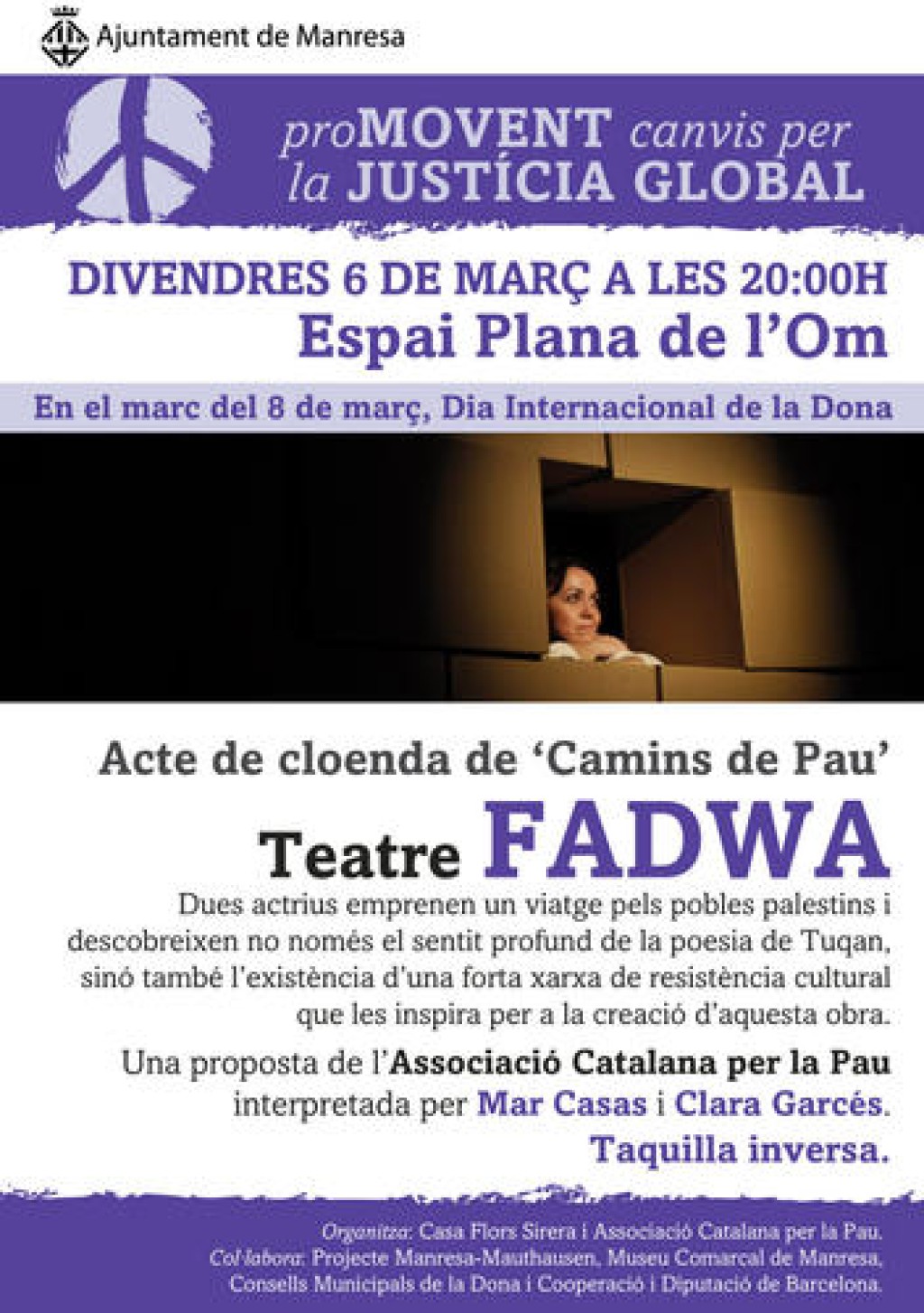 27/02/2020L’obra tindrà lloc a l’Espai Plana de l’Om el divendres 6 de març a les 20 h. És l’acte central de la campanya ‘ProMovent canvis per la Justícia Global‘ i esdevindrà la cloenda del projecte educat iu “ Camps, camins de Pau i Fadwa”. Paral·lelament, del 2 al 16 de març, s’exposarà la mostra fotogràfica ‘Dones en peu de lluita’ a la Plana de l’Om.