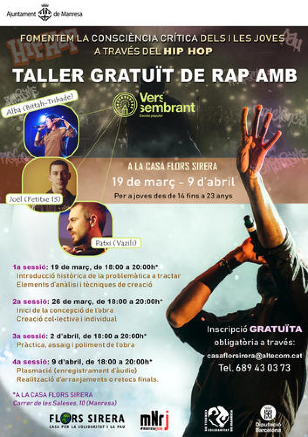 L’Ajuntament de Manresa, a través de la Casa per la Pau i la Solidaritat Flors Sirera i Manresa Jove, impulsen a partir del dijous 19 de març i fins al 9 d’abril un taller de rap per a potenciar que els i les joves expressin les seves inquietuds i repensin la societat. La finalitat és fomentar la participació dels i les joves de Manresa en la construcció d’una societat conscient i diversa. El taller se celebrarà a la Casa Flors Sirera el dies 19, 26 de març, 2 i 9 d’abril, de 18 a 20 hores i serà gratuït per a totes aquelles persones d’entre 14 i 23 anys que s’hi vulguin inscriure.