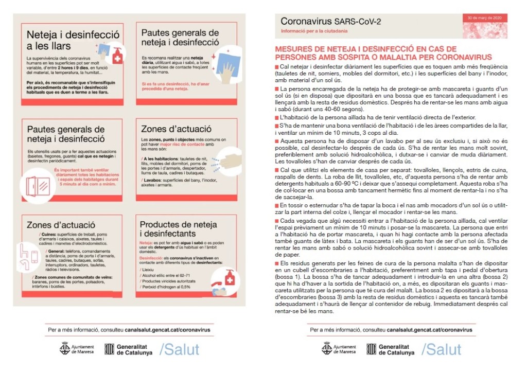 L'Ajuntament de Manresa demana a les famílies manresanes que, en l'actual situació de confinament, intensifiquin els procediments de neteja i dessinfecció a les llars per lluitar contra la propagació del coronavirus, i que segueixin amb el màxim rigor possible les mesures establertes pel Departament de Salut de la Generalitat de Catalunya en aquest àmbit.