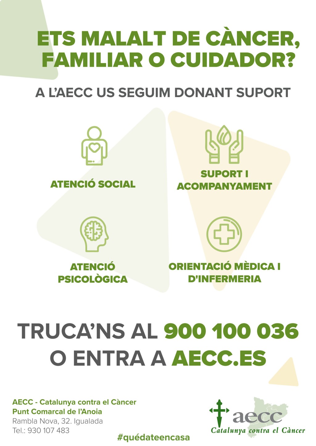 La Coordinadora de l'Associació Espanyola Contra el Càncer (AECC) del Bages - Catalunya Central informa que, davant la situació excepcional que s’està vivint per la crisi del coronavirius, envia un missatge d´escalf i suport a la ciutadania i comunica que tots els seus professionals d´Atenció Social i Atenció Psicològica continuen prestant servei, si bé de manera telemàtica, a tots els pacients i familiars que ho necessitin.