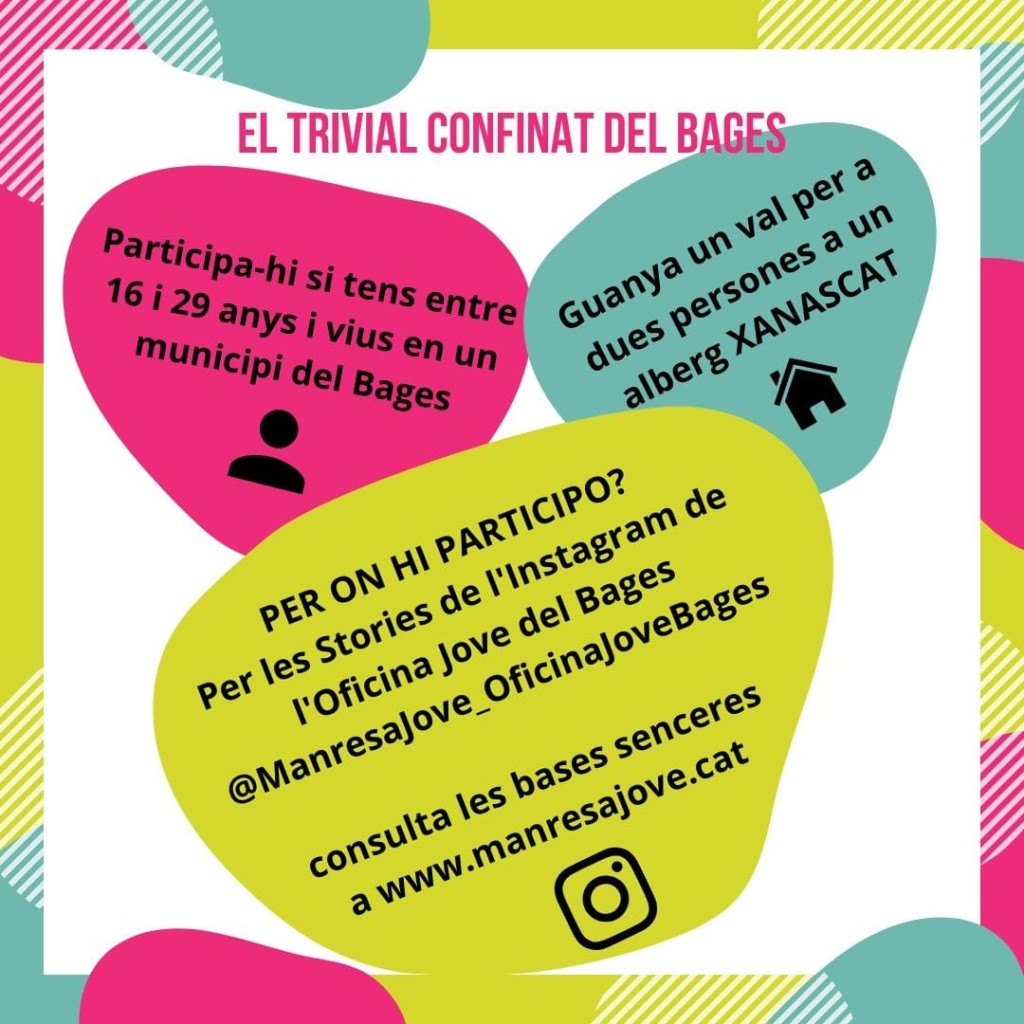 Avui 17 d’abril s’ha iniciat el joc del trivial a través de les històries de la xarxa social Instagram del perfil de l’Oficina Jove del Bages. Cada dos dies, es publicaran, per aquest canal, tres preguntes d’un municipi amb l’objectiu de donar a conèixer, entre les persones joves i la població bagenca en general, els serveis locals de joventut i tota la seva tasca d’una forma participativa i adaptada a la situació actual de confinament.