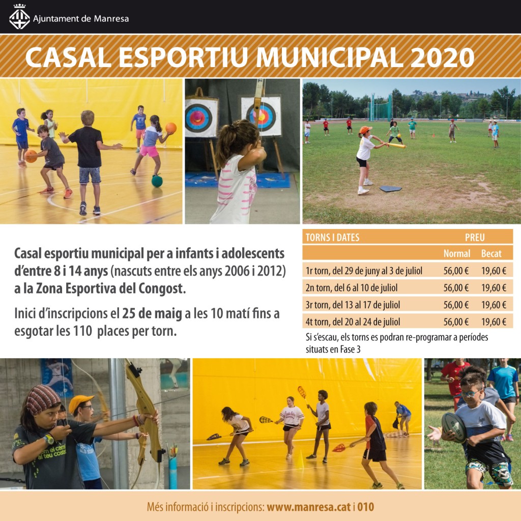 El proper dia 25 de maig, a les 10 de matí, comença el període d’inscripció dels Casals Esportius Municipals d’estiu, unes activitats adreçades a infants de 8 a 14 anys (nascuts entre els anys 2006 i 2012), amb l’objectiu d’ocupar el temps lliure d'infants i adolescents durant el període de vacances escolars d'estiu mitjançant la pràctica d'esports i activitats de caire recreatiu.
