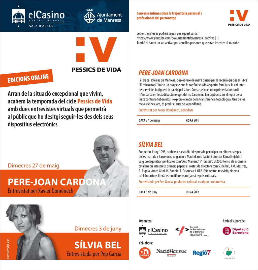 El nou cicle en forma virtual arrenca el dimecres 27 de maig, a les 8 del vespre, amb el científic Pere-Joan Cardona que conversarà amb el periodista Xavier Domènech, director adjunt de Regió7. Pere-Joan Cardona és doctor en Medicina i Cirurgia; especialista en Microbiologia i Parasitologia; membre del CIBER Enfermedades Respiratorias; i professor associat de Microbiologia i parasitologia mèdiques de les facultats de Medicina i Ciències Biomèdiques de la UAB. El científic manresà és el cap de la Unitat de Tuberculosi Exerimental, el grup de recerca que fa 20 anys que es dedica a investigar aquesta malaltia infecciosa a l'Institut de Recerca Germans Trias i Pujol (IGTP).