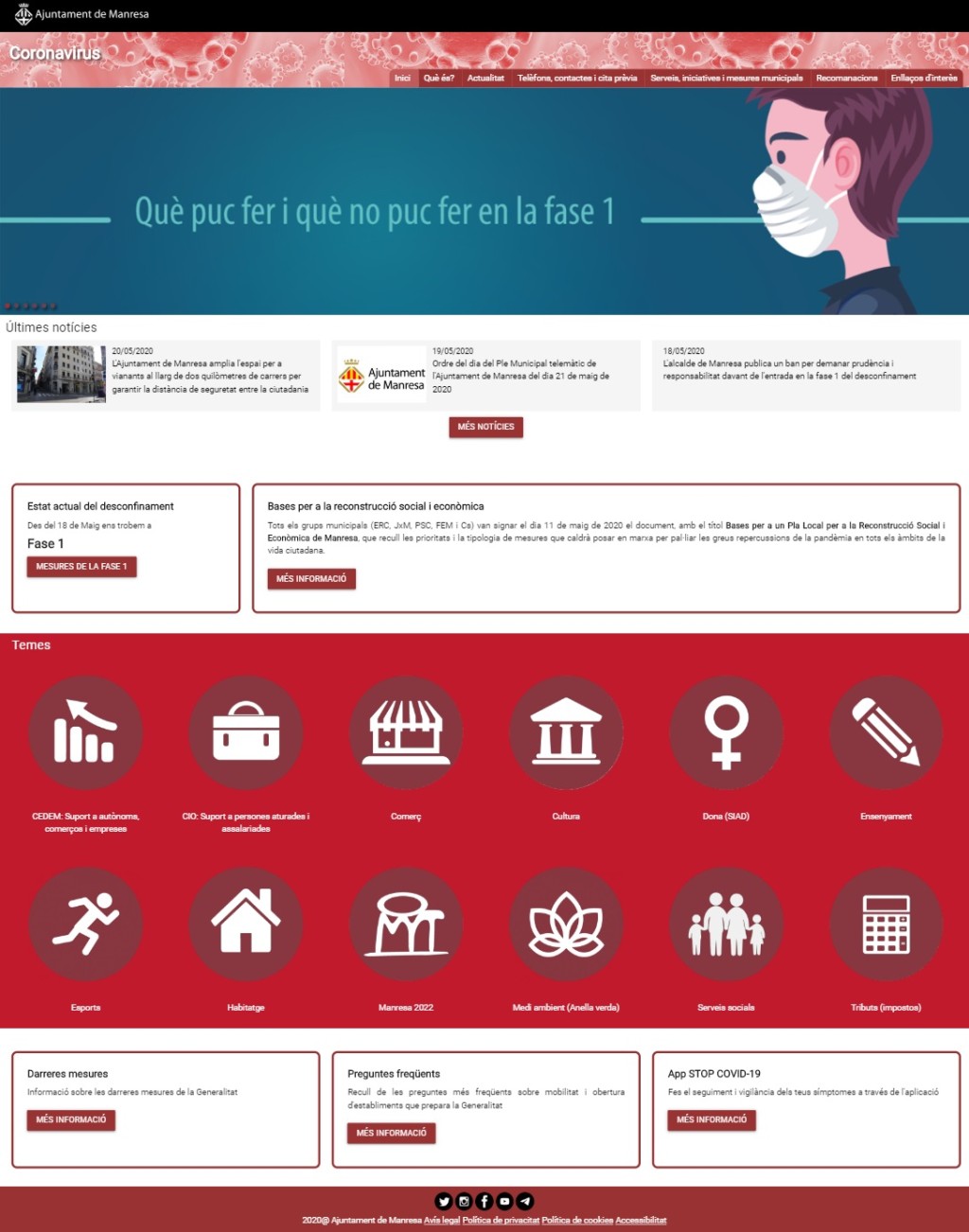 L’Ajuntament de Manresa ha posat en marxa un nou portal web amb informació relacionada amb el coronavirus que recull tota la informació generada pel consistori i els diferents serveis municipals, així com les últimes novetats relacionades amb les mesures i normatives impulsades pels governs de la Generalitat i de l'Estat.