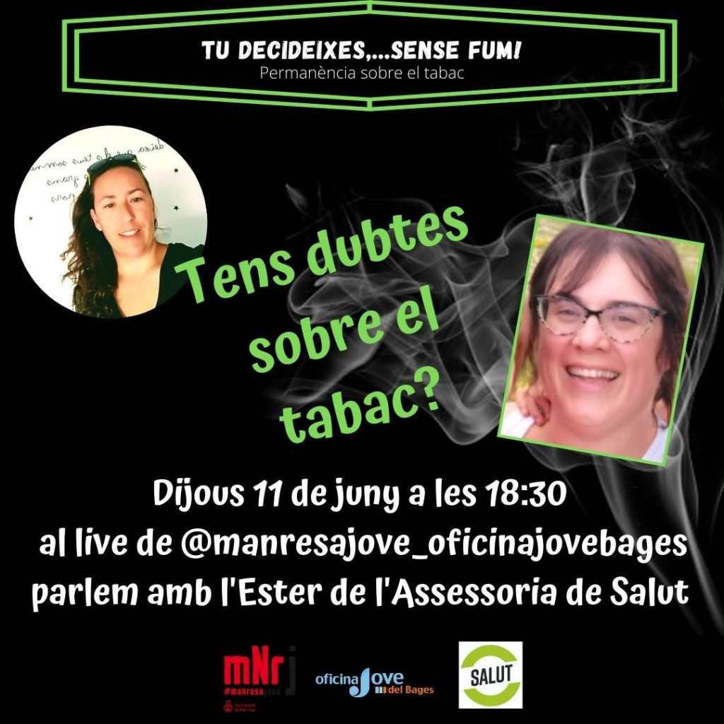 - 11 de juny: live d'Instagram (manresajove_oficinajovebages) amb l'Ester Duarri, de l'Assessoria de Salut i l'Arola Molas del Punt al Pati, per resoldre dubtes i desmentir mites en relació al tabac.