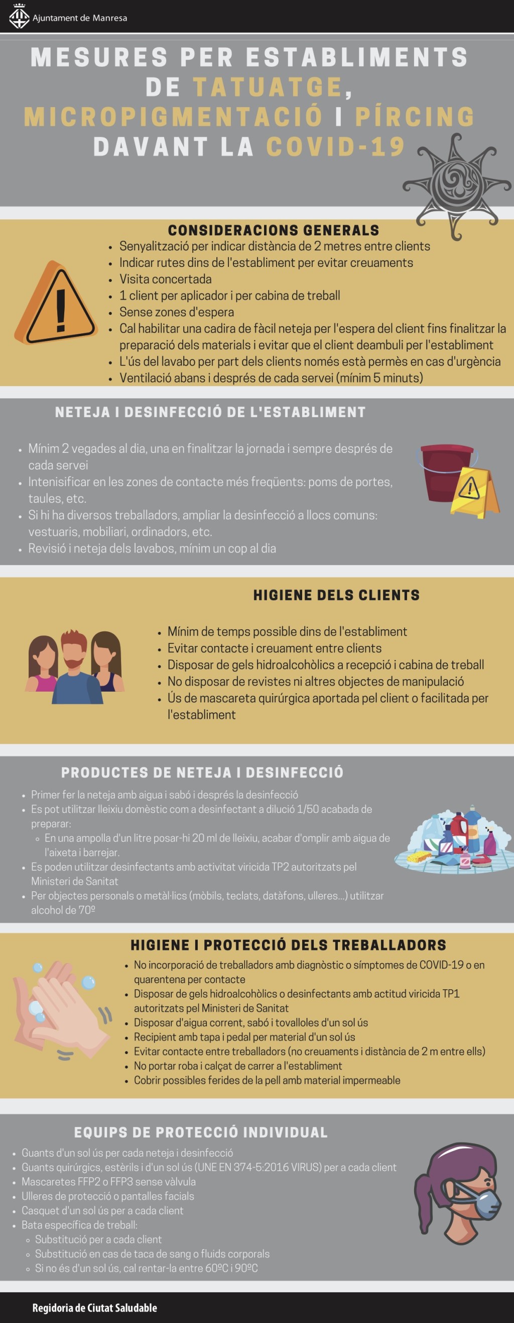 La regidoria de Ciutat Saludable de l’Ajuntament de Manresa posa a disposició dels establiments de tatuatge, pírcing i micropigmentació, i també a les piscines d’ús públic, informació i assessorament per tal de facilitar a aquests sectors la màxima informació especialitzada amb l’objectiu de minimitzar el risc d’exposició al virus de clients i treballadors i facilitar, així, que el desenvolupament de l’activitat es realitzi amb seguretat. La regidoria ha estat valorant els diversos programes de prevenció i control per a establiments de la ciutat i, en aquests sectors esmentats, s’ha considerat oportú reorientar i reforçar les directrius.