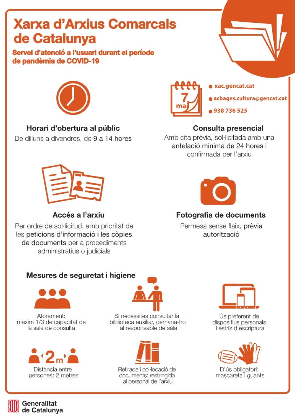 L'Arxiu Comarcal del Bages (ACBG) ha reobert la consulta pública presencial. Per tal de complir les directrius establertes durant l’etapa de desconfinament, s’estableix el servei de consulta amb cita prèvia, mitjançant el telèfon 93 873 65 25.