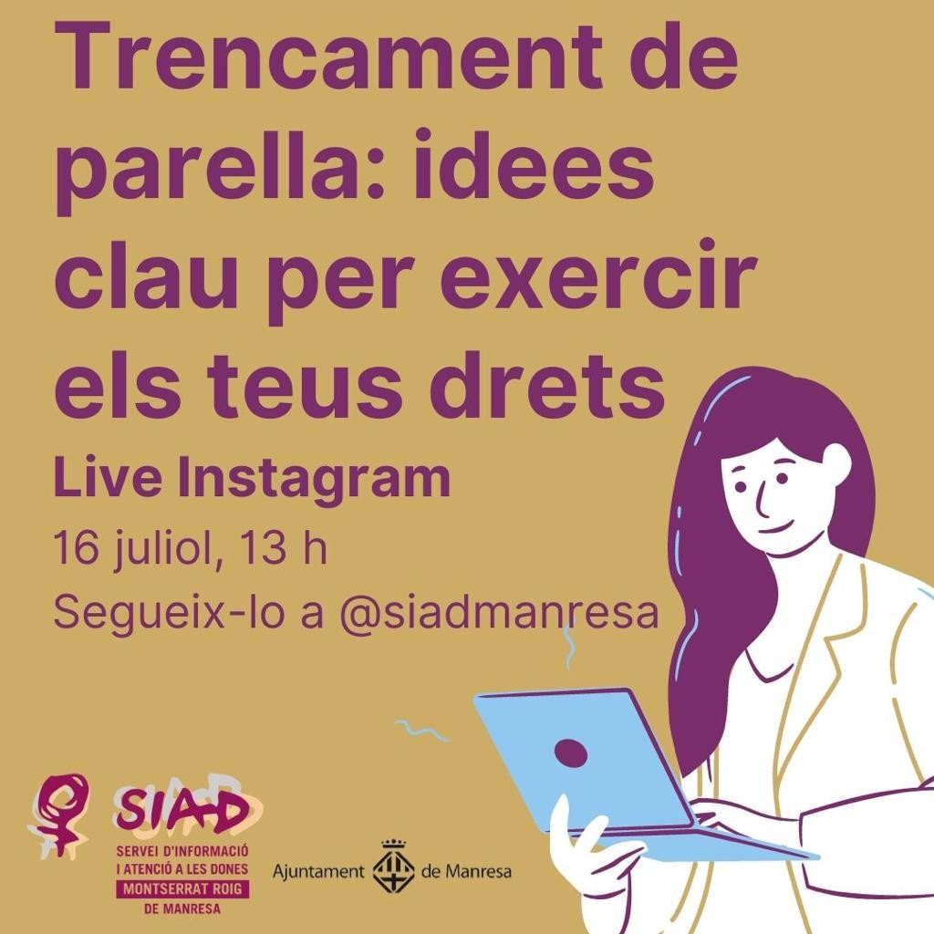 Aquest juliol el Servei d’Informació i Atenció a les Dones (SIAD) Monserrat Roig de Manresa oferirà dues sessions informatives de curta durada en directe a través d’Instagram. L’objectiu és donar a conèixer el servei i apropar-lo encara més a les dones de Manresa, i més ara, en la situació actual de pandèmia.