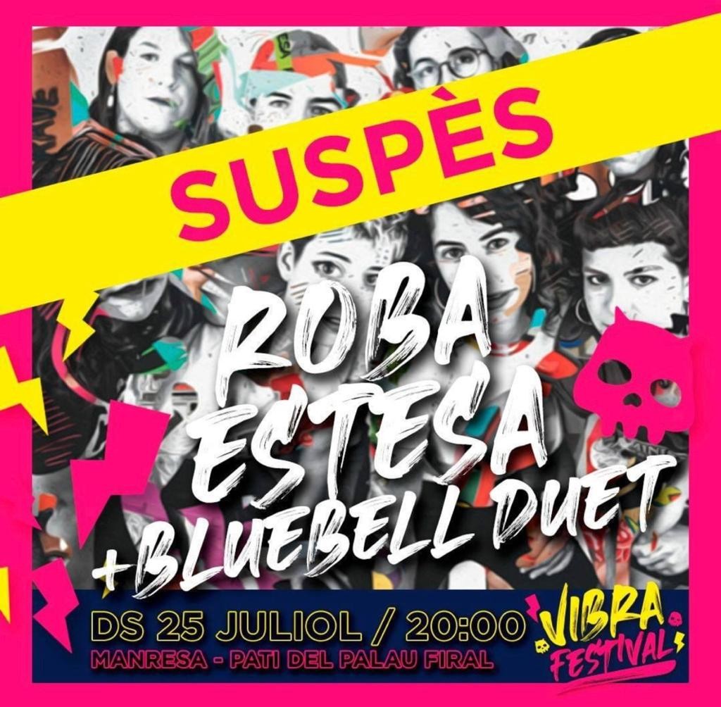 El grup Roba Estesa ha anunciat que suspèn el concert que havia de fer aquest dissabte 25 de juliol dins el Vibra Festival, organitzat per les Cases de la Música i l'Ajuntament de Manresa, per raons de salut.