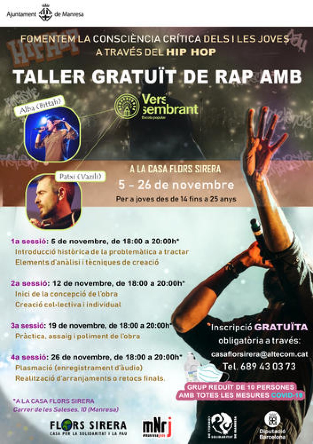 L’Ajuntament de Manresa, a través de la Casa per la Pau i la Solidaritat Flors Sirera impulsa a partir del dijous 5 de novembre i fins al 26 de novembre un taller de rap per a potenciar que els i les joves expressin les seves inquietuds i repensin la societat des d’una perspectiva integradora. La finalitat és fomentar la participació dels i les joves de Manresa en la construcció d’una societat conscient i diversa. El taller se celebrarà a la Casa Flors Sirera els dies 5, 12, 19 i 26 de novembre, de 18:00 a 20:00 hores i serà gratuït per a totes aquelles persones d’entre 14 i 25 anys que s’hi vulguin inscriure.