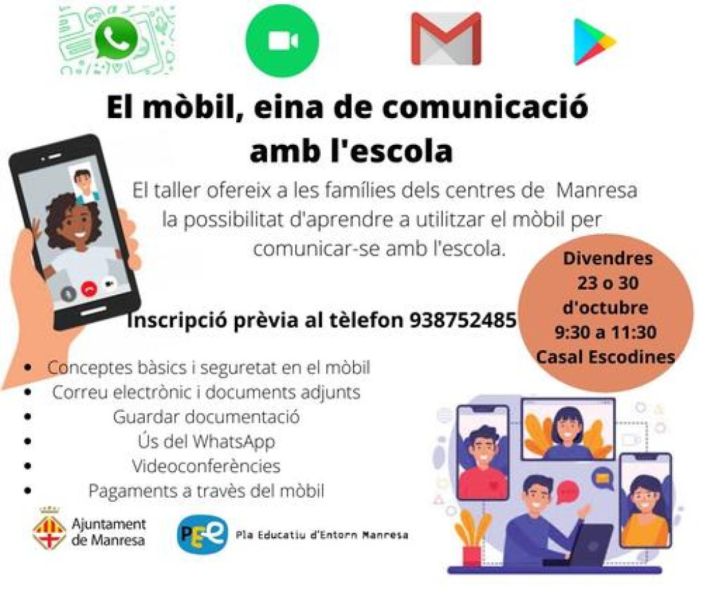 L'Ajuntament de Manresa conjuntament amb el Departament d’Educació, en el marc de les iniciatives impulsades des del Pla Educatiu d'Entorn (PEE), han organitzat el taller "El mòbil, eina de comunicació a les escoles", una proposta formativa adreçada a les famílies dels centres d'ensenyament de Manresa que té l'objectiu d'aprendre a utilitzar el mòbil per comunicar-se amb l'escola.