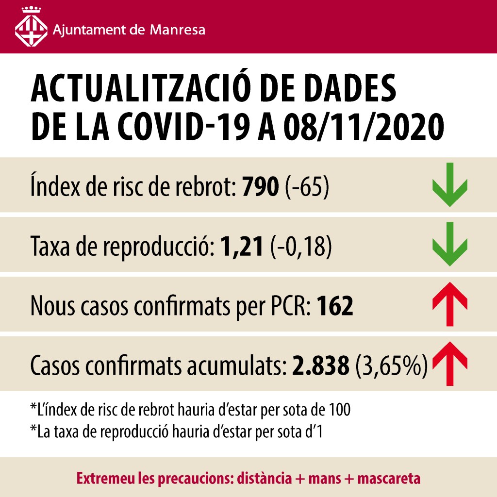 08/11/2020S’han detectat 46 positius entre persones que no presentaven símptomes. A Manresa, l’índex de rebrot i la taxa de reproducció descendeixen una mica respecte de divendres, però continuen estant molt per sobre del que seria recomanable. En els darrers tres dies s’han confirmat 162 nous casos de persones amb coronavirus. L’Ajuntament de Manresa fa una crida a la responsabilitat i demana a la ciutadania que no abaixi la guàrdia.