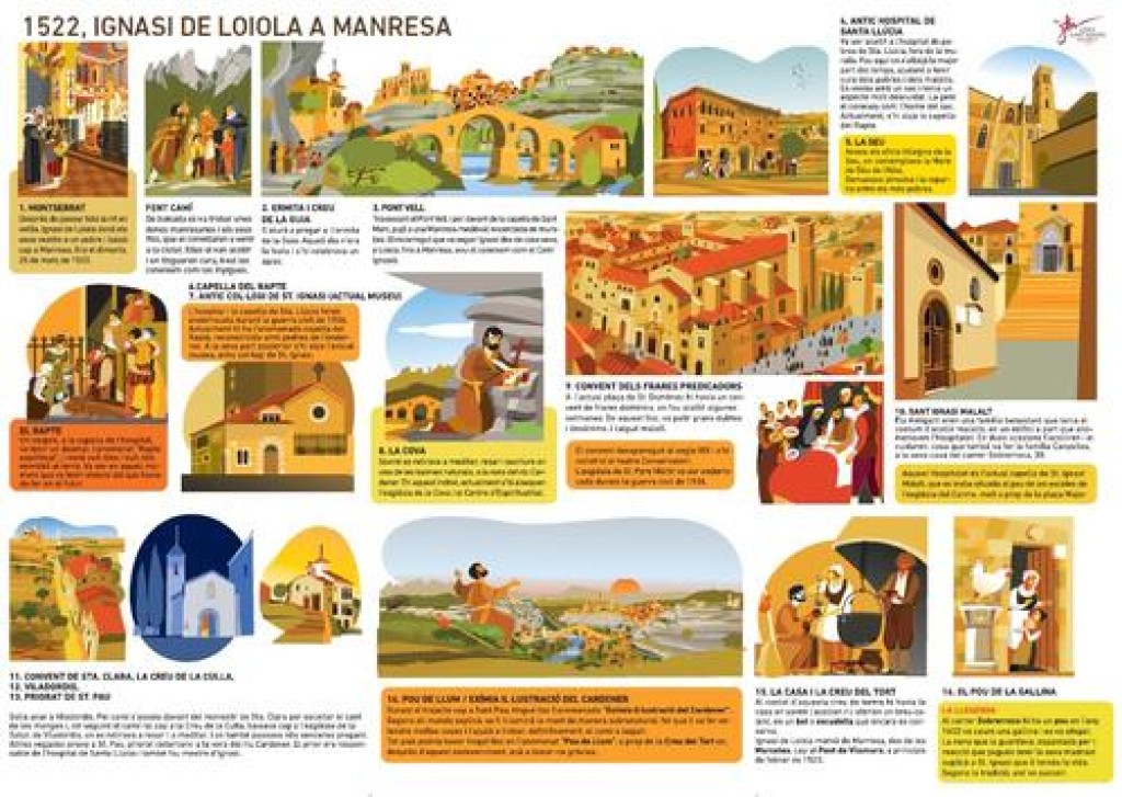 L’any 2015, de la mà de la Cambra de comerç i la Cova de Sant Ignasi s’edità la primera versió de l’auca de Sant Ignasi de Loiola amb un total de 16 vinyetes, il·lustrades per Jaume Gubianas, que expliquen l’estada d’Ignasi de Loiola a Manresa així com el patrimoni ignasià de la ciutat. Aquest any, i amb la voluntat d’actualitzar l’auca i donar-li un nou impuls, s’ha inclòs una nova vinyeta dedicada a les ínyigues, un grup de dones seguidores d’Ignasi i que en van tenir cura durant la seva estada a la ciutat, a la vegada que es fa referència també per primer cop al camí ignasià, recorregut que seguí Ignasi des d’Azpeitia fins a Manresa.