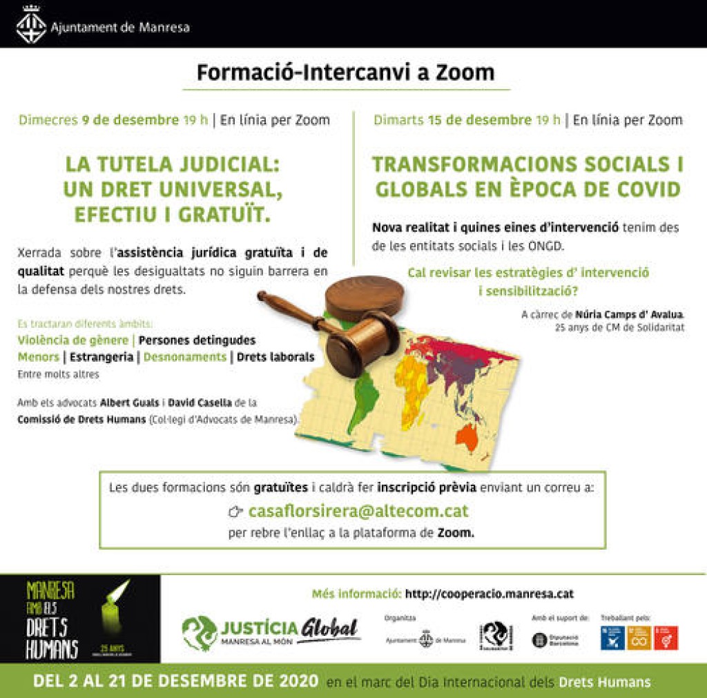 Des de la Comissió de Drets Humans del Col·legi d’Advocats de Manresa, en col·laboració amb el Consell Municipal de Solidaritat, s’ofereix una xerrada gratuïta ‘La tutela judicial: un dret universal, efectiu i gratuït’, que mostrarà de manera assequible el dret que tenen totes les persones de rebre tutela judicial efectiva i gratuïta. L’acte forma part de la campanya ‘Manresa amb els Drets Humans’, impulsada per la regidoria de Cooperació de l’Ajuntament de Manresa, en col·laboració amb el Consell Municipal de Solidaritat.