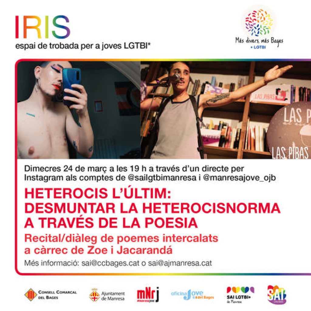 El proper dimecres 24 de març, a les 19 h de la tarda, es farà una nova activitat emmarcada dins de l'Espai Iris, espai per a joves LGTBI+ del Bages, organitzat conjuntament entre els SAIs del Consell Comarcal del Bages, l'Ajuntament de Manresa i l'Oficina Jove del Bages. En aquesta ocasió la proposta s'emmarca en una activitat virtual poètica, en directe, a través d'Instagram Live.