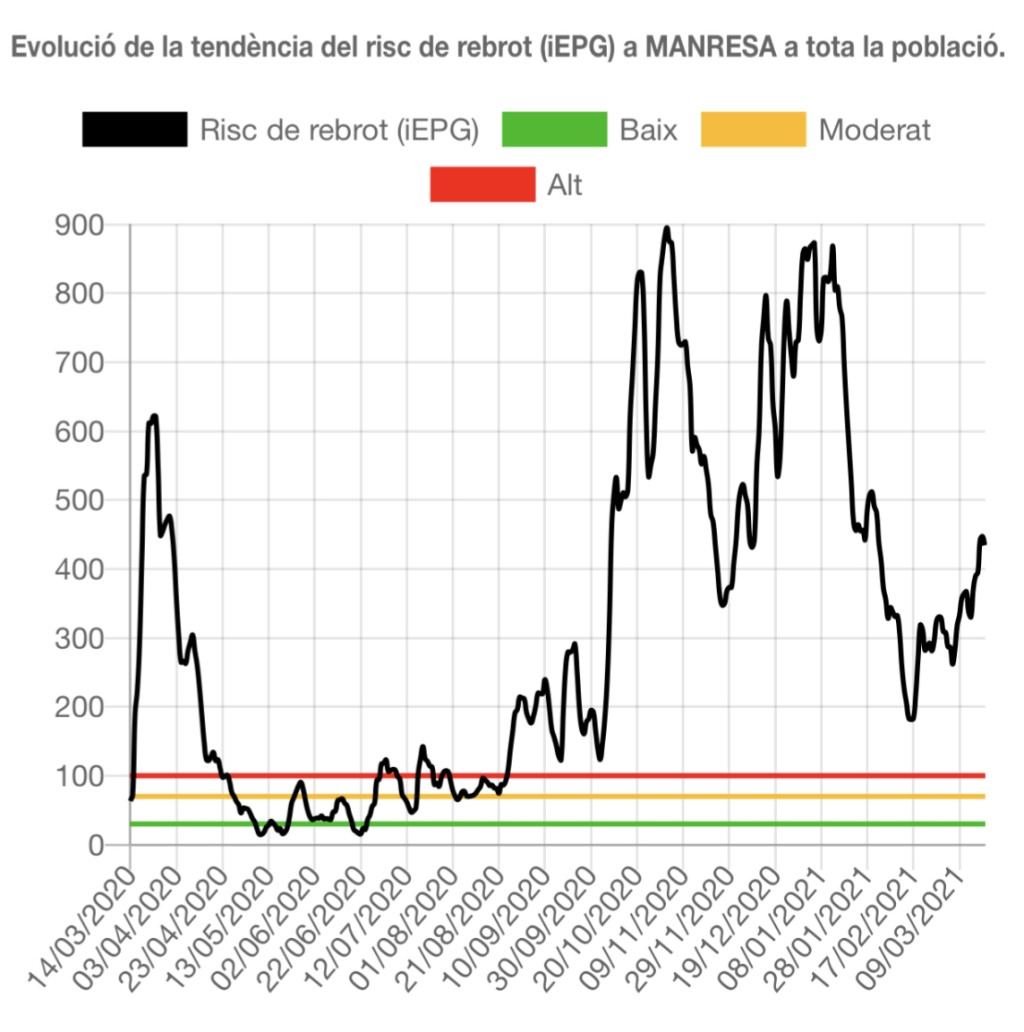 L’Ajuntament de Manresa demana a la ciutadania extremar les precaucions davant l’augment del risc de rebrot de Covid a la ciutat. La corba, que entre el 15 de gener i el 15 de febrer havia dibuixat una tendència descendent fins a situar-se per sota dels 200 punts —baixant dels 868 als 181,56— dibuixa ara un significatiu increment i s’ha situat als 434 punts. Pel que fa a la taxa de reproducció, que entre gener i febrer també s’havia aconseguit reduir per sota d’1, se situa ara a 1,25.