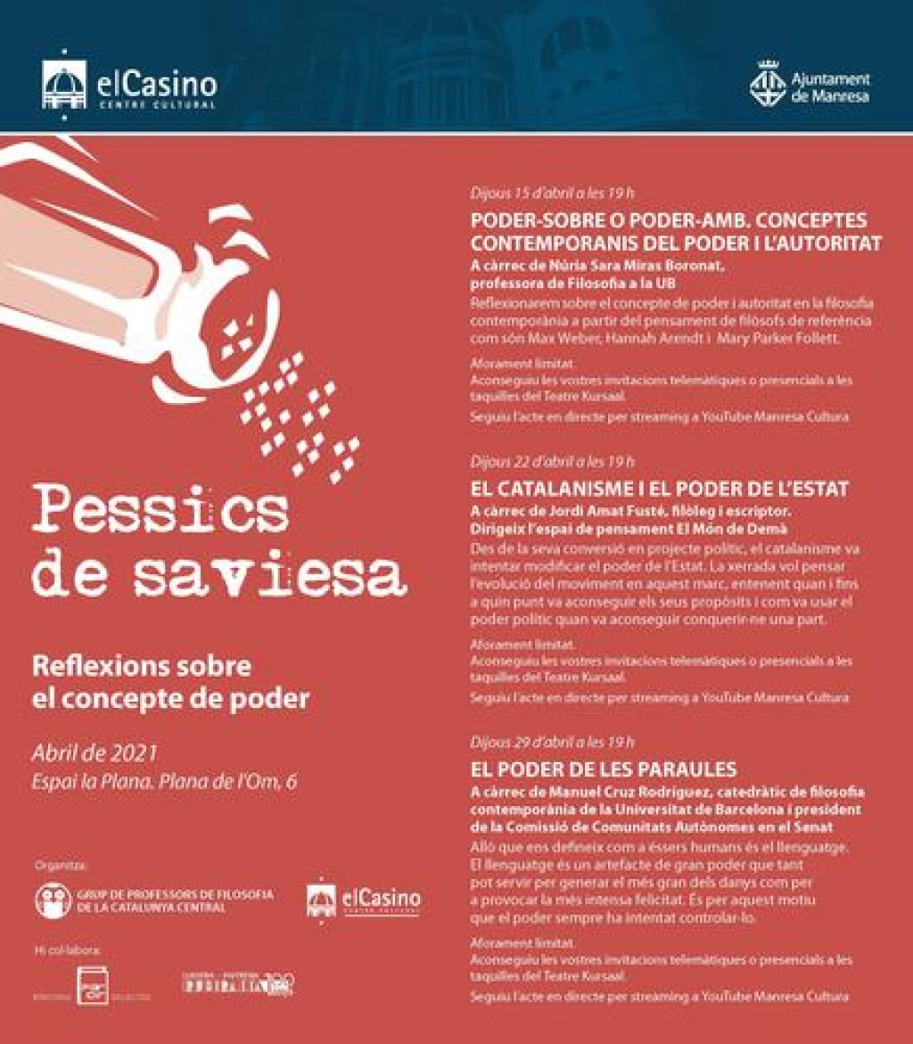 Aquest nou cicle arrenca el dijous 15 d’abril, amb la conferència “Poder-sobre o poder-amb. Conceptes contemporanis del poder i l’autoritat”, a càrrec de Núria Sara Miras Boronat, professora de Filosofia de la Universitat de Barcelona.