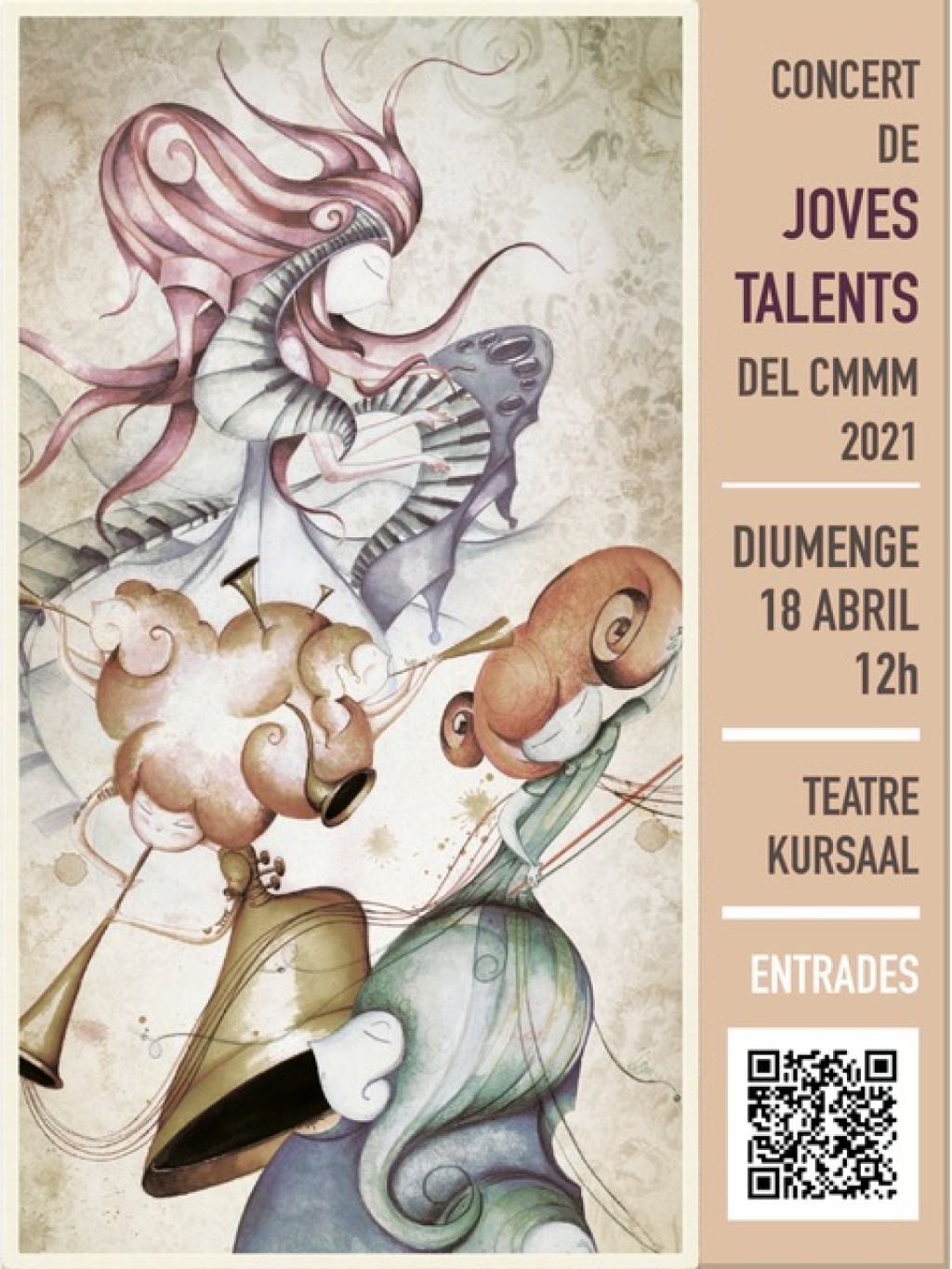 14/04/2021Es farà a la sala petita del Kursaal, aquest diumenge 18 d’abril, a les 12 del migdia. A més a més, el Conservatori impulsa una exposició al Casino del professor de tuba i música de cambra Joan B. Domènech, que és també artista plàstic.