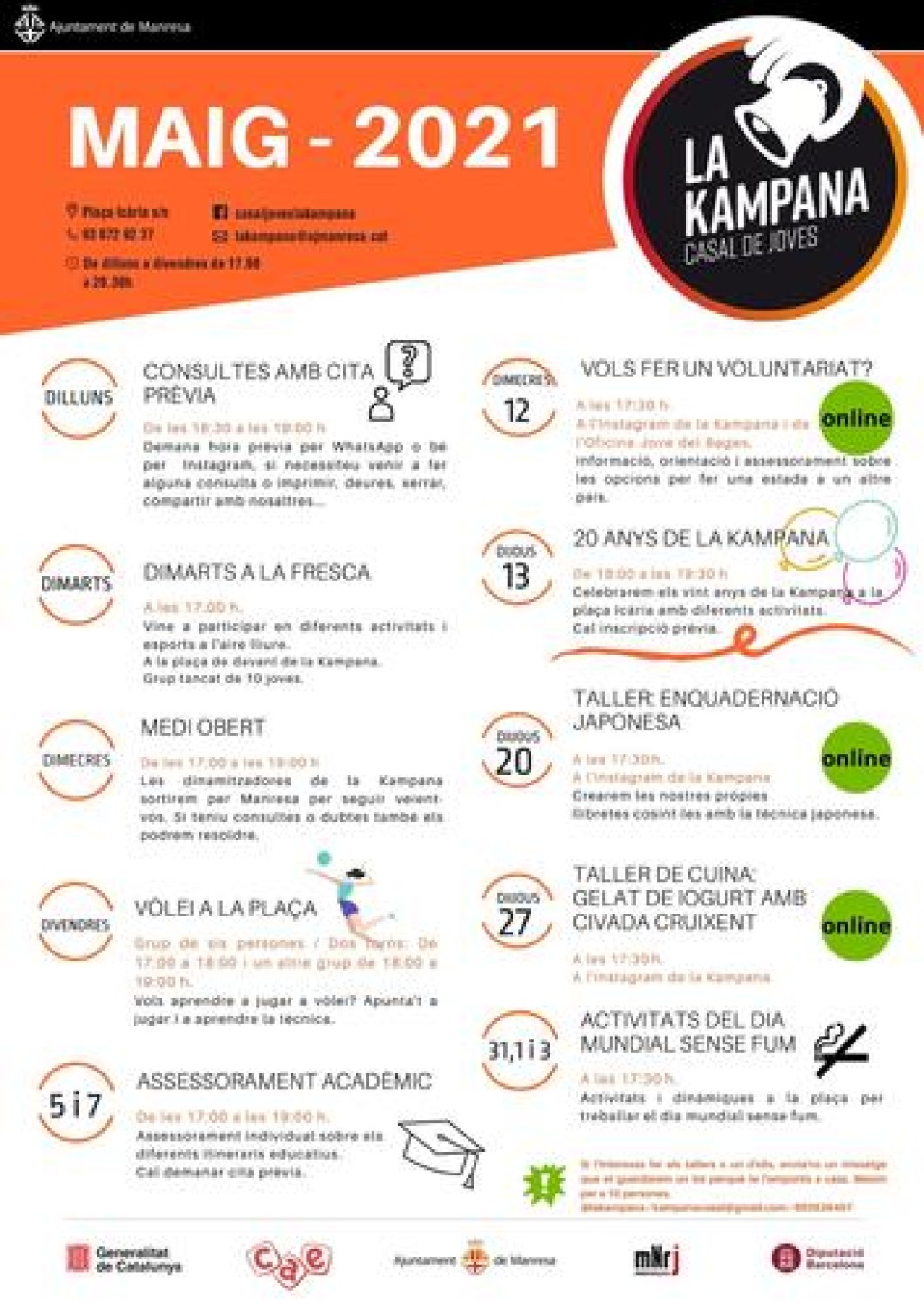 L’Ajuntament de Manresa, a través de Manresa Jove, ha programat per al pròxim mes de maig diferents activitats, tallers i exposicions adreçades al públic jove. La major part de les activitats tindran lloc a l’Espai Jove Joan Amades-Oficina Jove del Bages i al Casal de Joves La Kampana i es duran a terme tenint en compte totes les mesures sanitàries decretades pel govern.