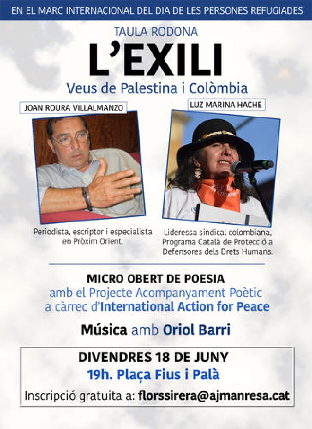 14/06/2021L’activitat, emmarcada dins dels actes per commemorar el Dia Internacional de les Persones Refugiades, es durà a terme el pròxim 18 de juny a les 19 h a la plaça Fius i Palà. Es clourà amb un recital poètic sobre drets Humans i exili i una actuació musical a càrrec d’Oriol Barri. Les persones interessades a assistir-hi, es poden inscriure enviant un correu electrònic a florssirera@ajmanresa.cat.