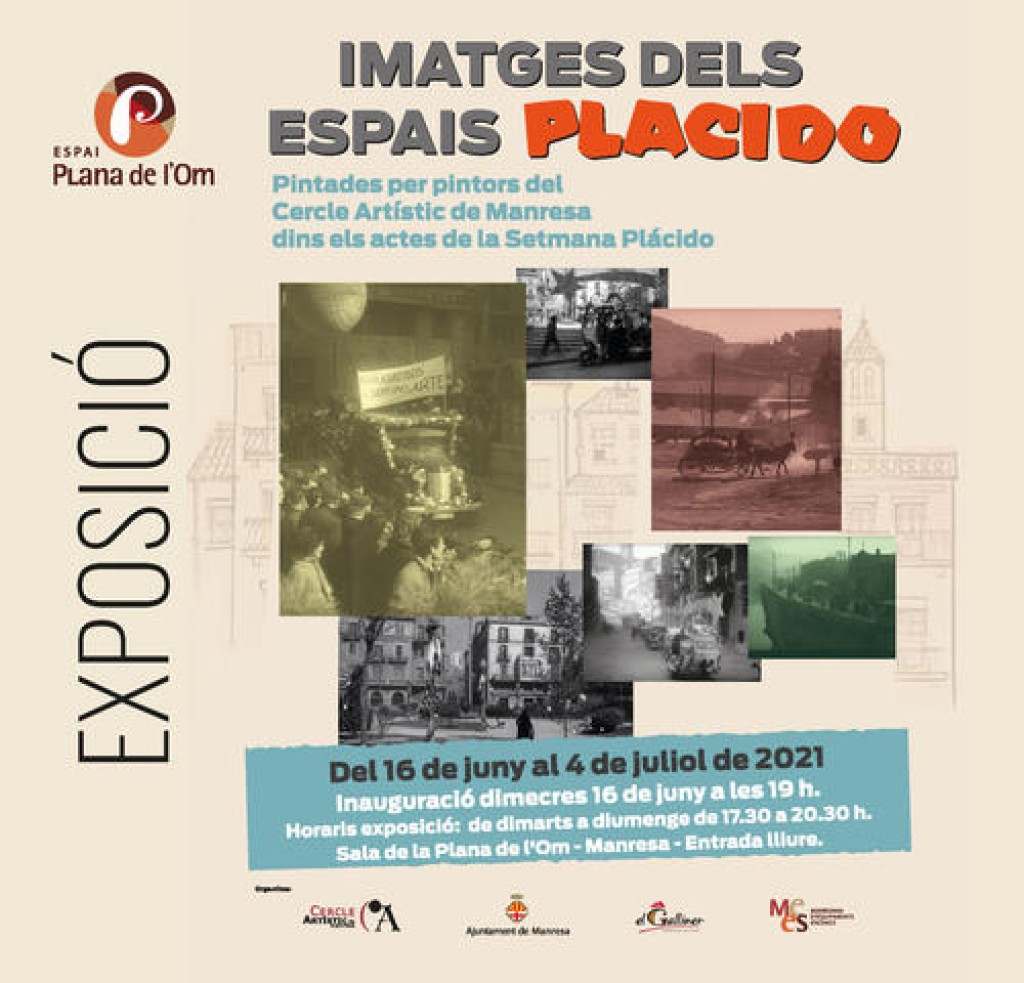 A partir d'avui dimecres i fins al 4 de juliol es podrà visitar a la sala d’exposicions de la Plana de l’Om de Manresa la mostra ‘Imatges dels espais ‘Plácido’, un total de 23 quadres que han pintat 21 pintors del Cercle Artístic de Manresa, en una activitat inclosa dins de la Setmana Plácido que es va celebrar a la ciutat entre el 17 i el 23 de maig passat.