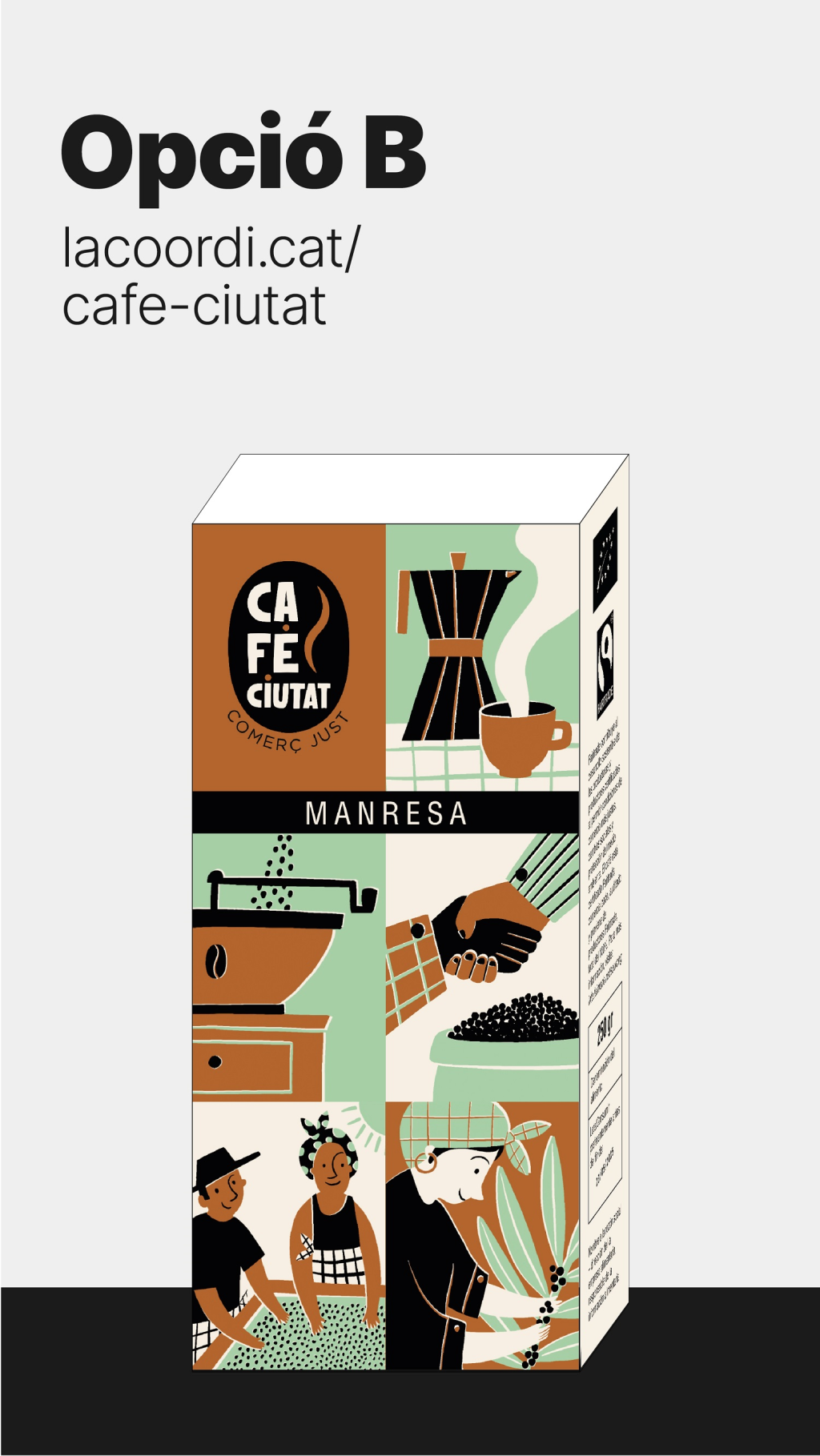 La imatge escollida ens explica una història, fent un recorregut del procés del cafè des de la collita fins a la tassa. Utilitzant la il·lustració per fer un disseny més humà i amb personalitat, destaca el treball digne i les relacions horitzontals entre les persones. El comerç just segueix principis que garanteixen la dignitat en el treball, i també el respecte mediambiental, l’equitat de gènere i la democràcia en la presa de decisions.