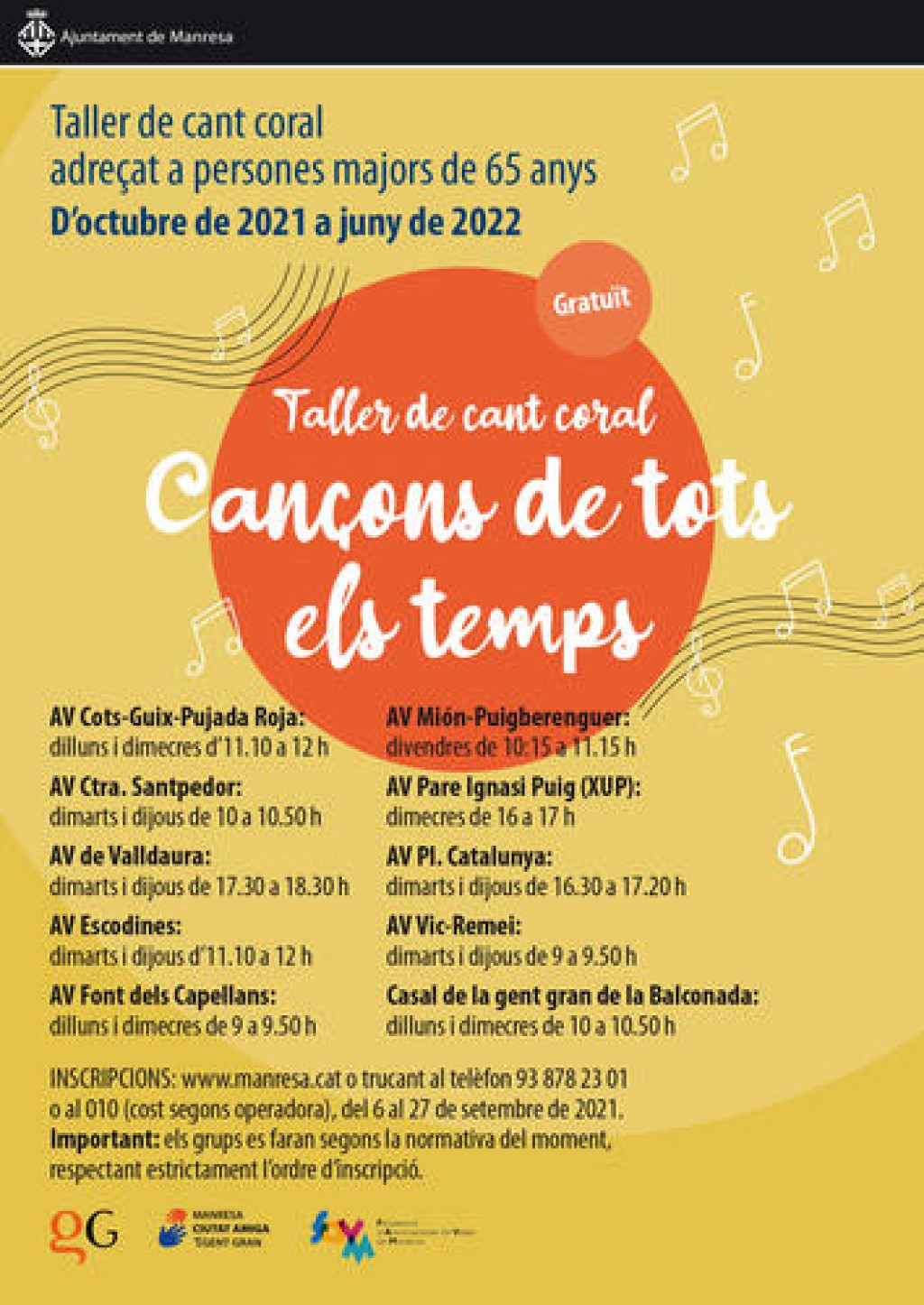 Del 6 al 27 de setembre es podran realitzar les inscripcions a l’activitat de cant coral “Cançons de tots els temps” que s’organitza des del Programa de Persones Grans de l’Ajuntament de Manresa en conveni amb algunes associacions de veïns de la ciutat. Per participar a l’activitat és imprescindible formalitzar la inscripció a través del següent formulari de la web municipal o bé presencialment a l’Oficina d’Atenció al Ciutadà o trucant al telèfon 93 878 23 01 o al 010 (cost segons operadora).