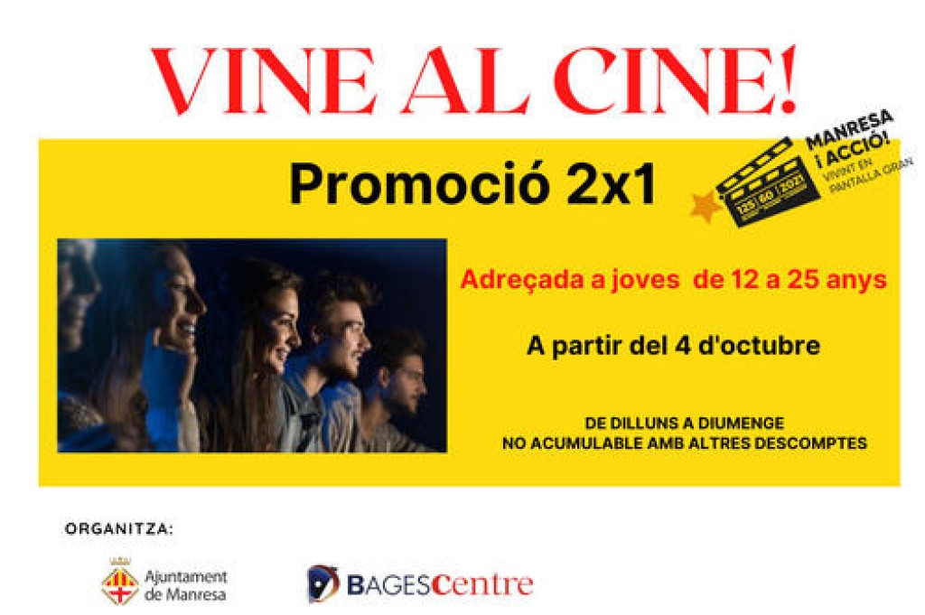 La promoció consistirà en l’oferta de dues entrades al preu d’una (2x1). Els destinataris són els joves de 12 a 25 anys i el descompte no serà compatible amb cap altra promoció comercial de Bages Centre. Per accedir-hi caldrà que les persones beneficiàries acreditin per qualsevol mitjà l’edat a taquilla.