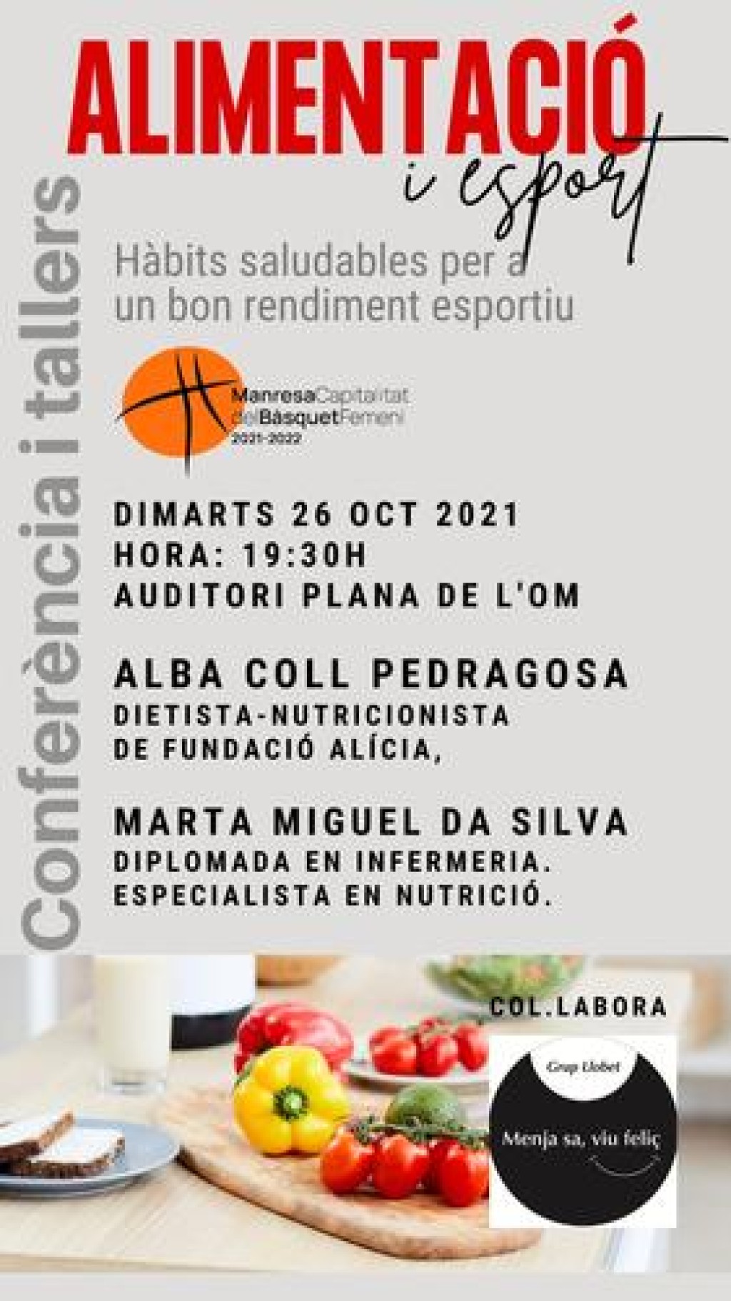 La programació continuarà aquest dimarts 26 d’octubre a les 19.30 hores a la sala de la Plana de l’Om amb una conferència d’alimentació que tractarà sobre els hàbits saludables per a un bon rendiment esportiu. Aquesta primera xerrada –inclosa dins l’eix “Més enllà del bàsquet”- anirà a càrrec de la Dietista-Nutricionista de la Fundació Alícia, Alba Coll Pedragosa, i de la Diplomada en infermeria i especialista en nutrició, Marta Miguel da Silva. La xerrada també comptarà amb una petita demostració per part de les ponents d’unes receptes per els/les esportistes poden realitzar en dies d’entrenament o partit. Les inscripcions són gratuïtes i només cal fer el registre previ a la web de Manresa, Capitalitat del bàsquet Femení: http://cbfmanresa.cat/cbfmanresa/
