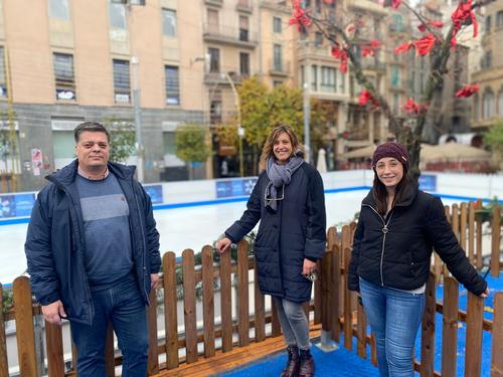La presidenta de la UBIC, Tània Infante Martínez; la regidora de Comerç de l’Ajuntament de Manresa, Núria Masgrau Fontanet; i Josep Garcia Santamaria, representant de Guixés Energia, amb una foto conjunta a la plaça Sant Domènec, al costat de la pista de gel, anuncien l’inici d’una campanya de Nadal que arrenca amb la voluntat que recuperi, amb prudència, la força anterior a la pandèmia de la Covid-19.