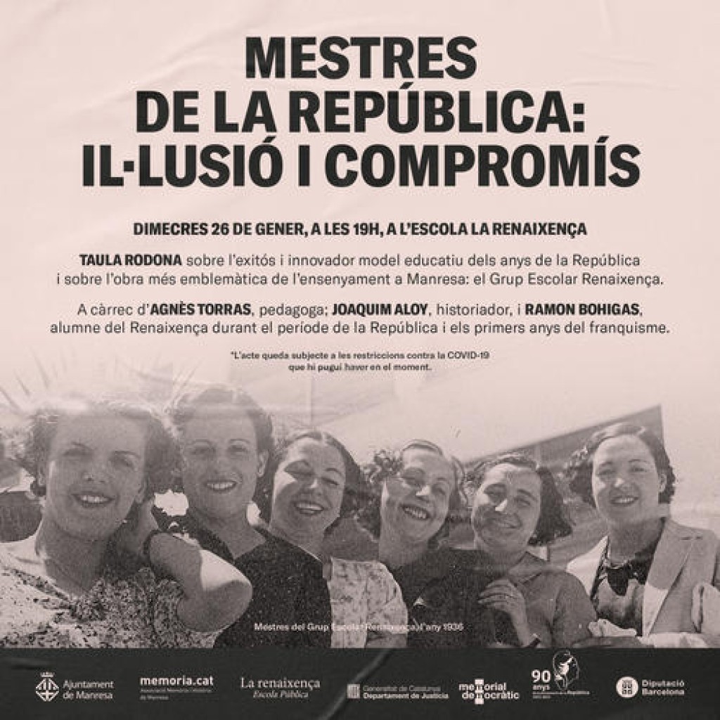 Amb el títol “Mestres de la República: il·lusió i compromís”, l’Ajuntament de Manresa i l’Associació Memòria i Història de Manresa han organitzat una taula rodona sobre l’exitós i innovador model educatiu dels anys de la República i sobre l’obra més emblemàtica de l’ensenyament a Manresa: el Grup Escolar Renaixença.