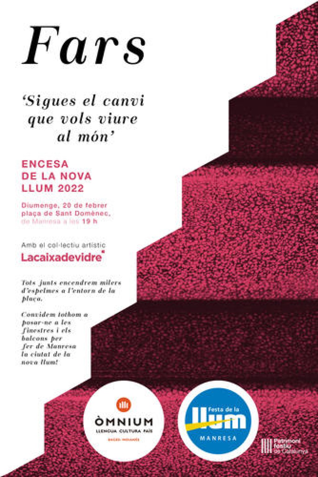 L’acció es farà, com cada any, en la vigília de la Festa de la Llum de Manresa, 20 de febrer, a les set del vespre. Tot i que l’any passat es va haver de fer en format reduït a l’auditori de la Plana de l’Om per la situació sanitària, aquest any recupera l’espai del voltant de la plaça Sant Domènec i presenta el projecte artístic Fars, de La Caixa de Vidre, que ens proposa trobar la llum individual com a camí cap a una emancipació col·lectiva, mitjançant dues instal·lacions artístiques que recolliran veus de la comunitat. Persones de diferents edats (infància, joventut, edat adulta i vellesa) han participat en un vídeo col·lectiu que es projectarà en la instal·lació de l’Encesa, envoltada de milers d’espelmes, que encendran persones voluntàries. L’organització convida tothom a posar-ne a les finestres i els balcons per fer de Manresa la ciutat de la nova llum.