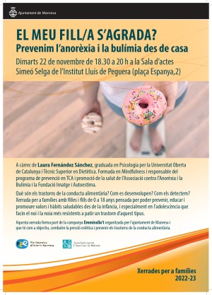 Tindrà lloc dimarts vinent, a les 18.30 h, a la sala d’actes de l’Institut Lluís de Peguera. La xerrada forma part de la campanya Emmiralla’t, organitzada pel consistori i que té com a objectiu combatre la pressió estètica i prevenir els trastorns alimentaris.
