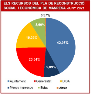 Els grups municipals reunits a la Junta de Portaveus acorden el tancament del Pla de Reconstrucció Social i Econòmica de Manresa, que va començar a caminar el maig de 2020, en plena pandèmia del coronavirus. L'últim informe de seguiment del Pla, que s'ha presentat al Ple aquest dijous, constata que s’hi han destinat 6.070.801,32 euros i que l'Ajuntament ha estat l'administració pública que més cost ha assumint del Pla amb un 51,16% del total, tot i que aquest mes l'estat ha guanyat protagonisme amb una aportació de 515.997,17 euros per compensar les pèrdues del bus urbà per la caiguda d'usuaris durant la crisi sanitària.